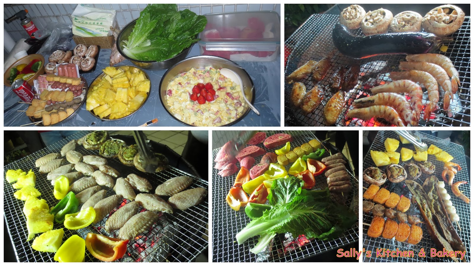 炭燒有: 腸仔。丸。菠蘿。三色椒。大海蝦。雞翼。大蘑菇。粟米。原條茄子。